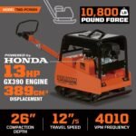The TMG-PC900H 10,800-lb Reversible Hydraulic Plate Compactor is powered by a Honda GX390 EPA gasoline engine. With 13 horsepower at your fingertips, this compactor packs a serious punch. A pounding force of 10,800 lb and compaction depth of 26″ inches means it can tackle even the most challenging surfaces and heavy-duty commercial jobs. Ideal for professional contractors who want to save time and money on large scale operations.