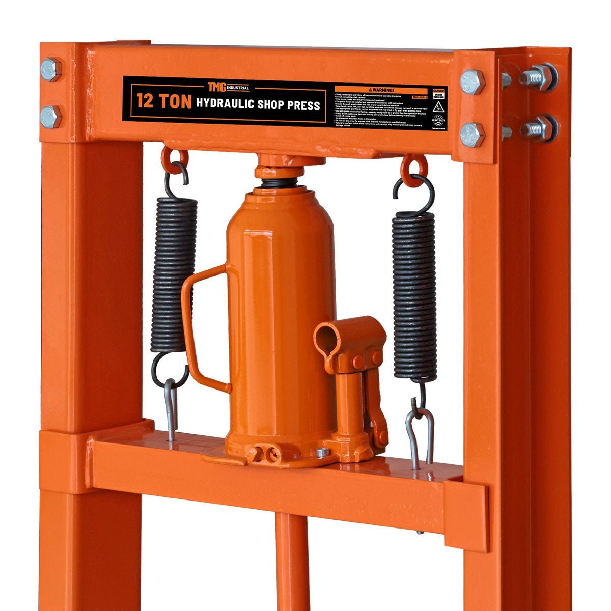 The TMG-ASP12 Hydraulic Shop Press is an essential piece of equipment for automotive shop, machining, metalworks, fabrication, or assembly operations. 12 tons of pressing capacity and a heavy duty H-frame makes pushing bearings onto shafts, stamp work, bending or flattening metal safe, efficient and easy to do.