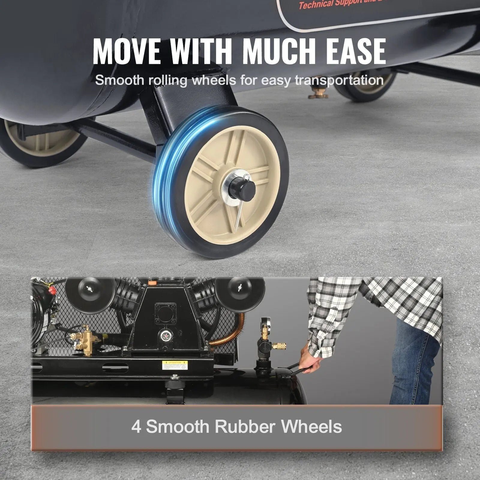 Equipped with 4 smooth-rolling wheels, this piston pump air compressor defines ease of movement. Whether it’s outdoor projects or long hauls, transport is a breeze, making it your go-to for any location.