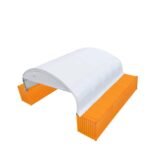 Made of strong, heavy-duty commercial grade polyvinyl chloride (PVC) fabric that is triple layered to prevent tearing and provide a long-lasting shelter covering for many years. This fabric is a natural flame retardant, commonly used in large commercial structures such as sports stadiums and event halls. The enclosed end wall and front drop provide an extra layer of protection for your machinery and weather sensitive cargo. Endwall is designed for standard 40′ GP containers; a 14″ base will need to be added if using HC containers.