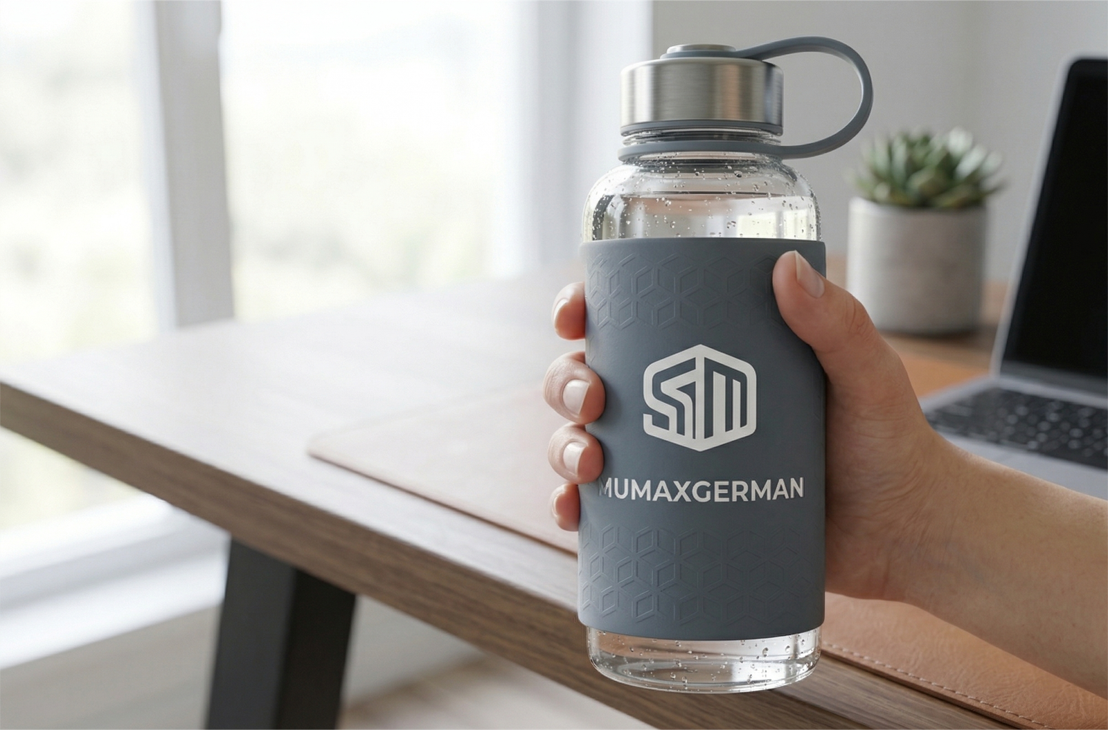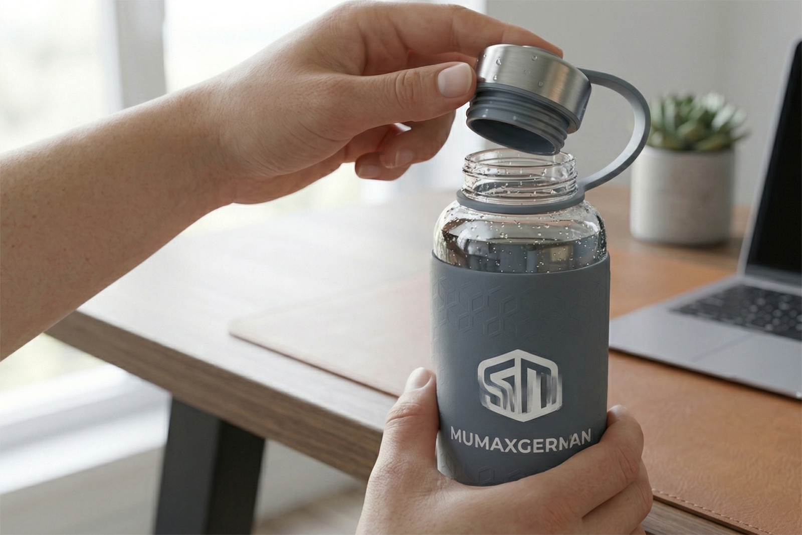 Protective Aesthetics: The Silicone Sleeve To ensure both durability and a comfortable, secure grip, the MUMAXGERMAN PureFlow is encased in a premium, food-grade silicone protective sleeve. This sleeve isn’t just for show; its textured pattern provides an exceptional slip-resistant surface, making it safe to handle even with sweaty hands. The sleeve also offers significant impact protection, absorbing minor bumps and preventing fractures, so you can confidently carry your glass bottle in your purse, gym bag, or backpack without constant fear of breakage. The soft-touch silicone also provides subtle insulation, helping to keep your beverage’s temperature stable for longer while offering a luxurious feel in hand.