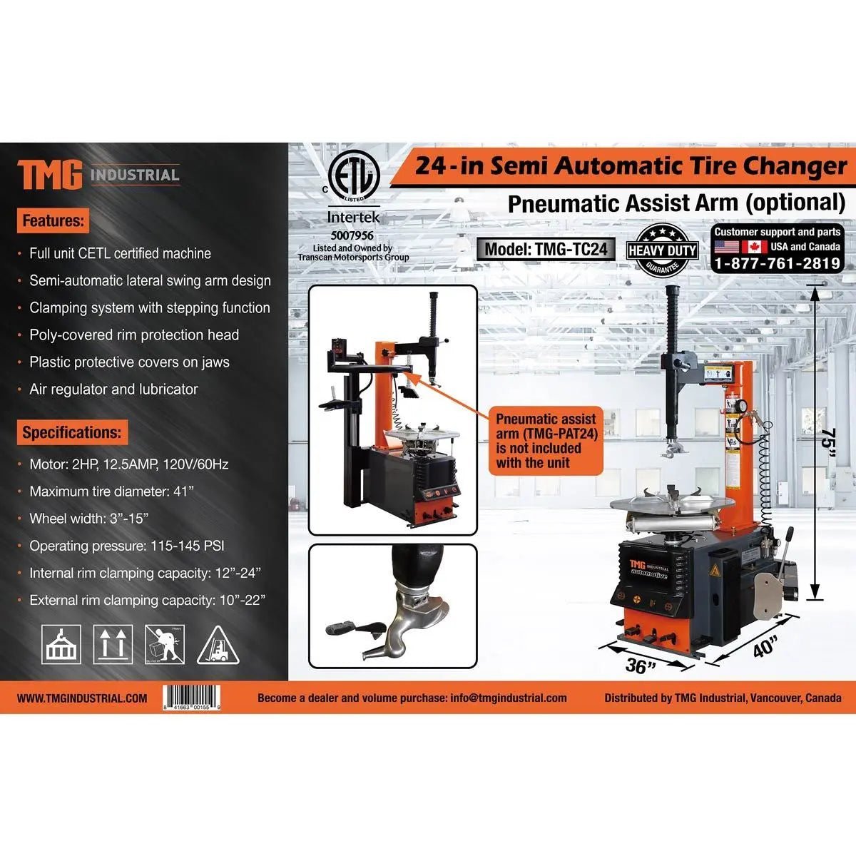 The TMG-TC24 Semi-Automatic Tire Changer is a fundamental machine for small to medium-sized tire shops or general automotive service departments. It ensures maximum protection and efficiency when changing tires of all sizes, styles, brands, and classes without damaging the rim or tire itself. Reduce exhausting labour for you and your employees, making everyday operations easier with this electrically powered, compact automotive shop essential.